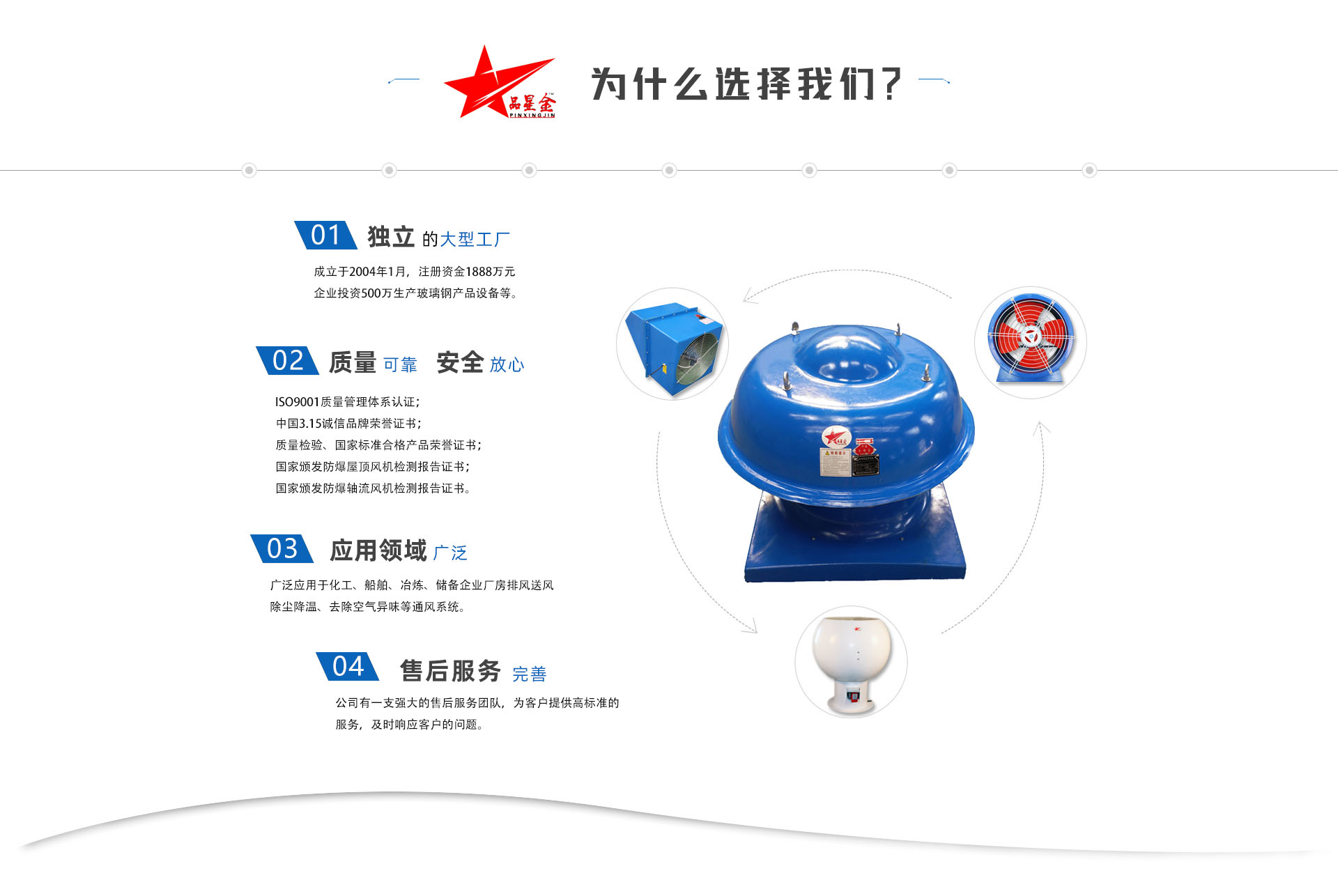 公司生產屋頂風機、玻璃鋼防爆屋頂風機、玻璃鋼防爆軸流風機、玻璃鋼防爆邊墻風機、防爆軸流風機、玻璃鋼斜流風機 、玻璃鋼離心風機 、玻璃鋼防雷防爆電動風帽 、玻璃排氣扇 、玻璃鋼通風器 、玻璃鋼防雨風機帽 、玻璃鋼冷卻塔、新風機組、風機盤管、風量調節閥、鋁合金風口 、各種材質通風管道、等產品。